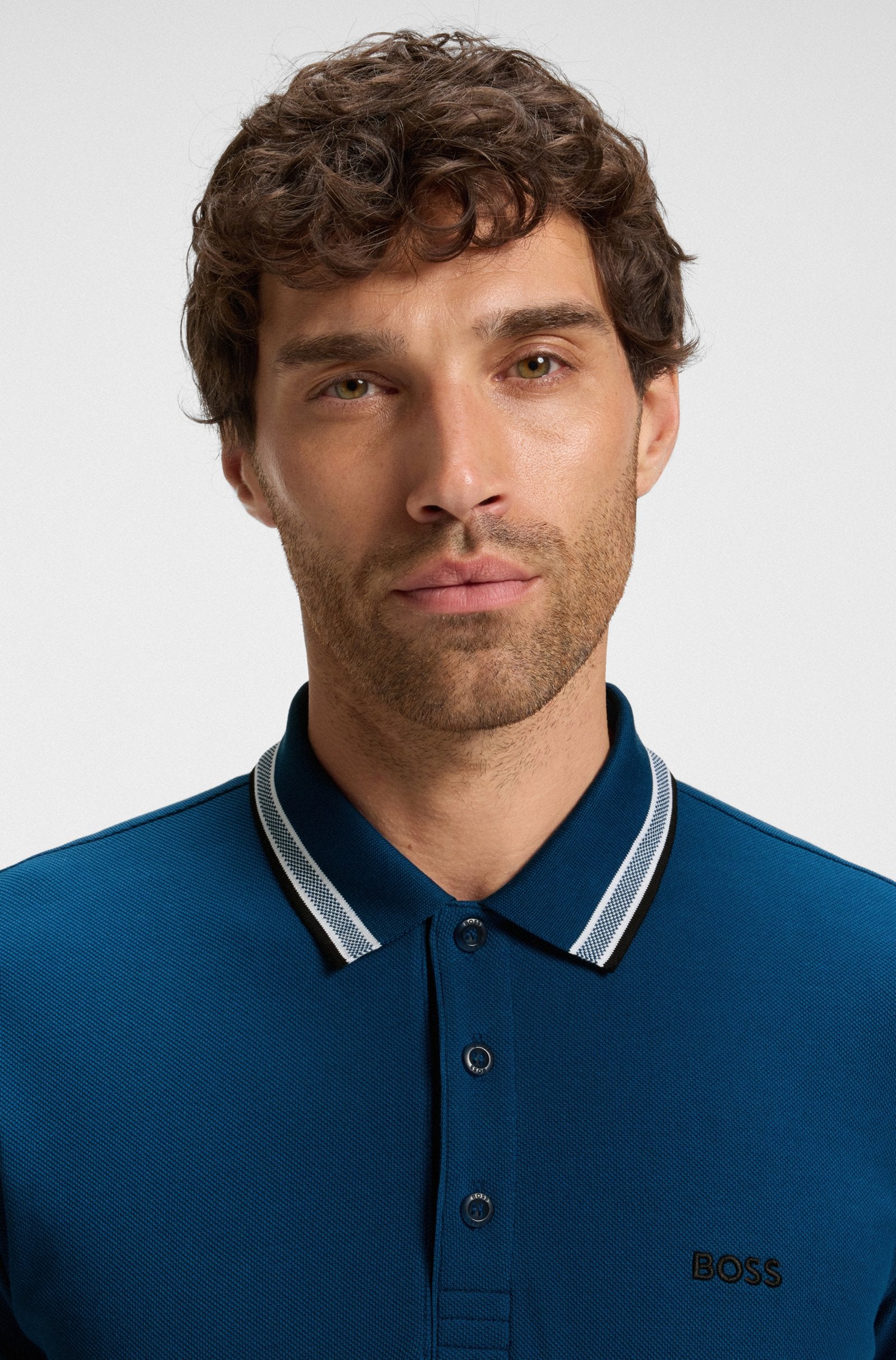 Style: Boss Athleisure men's polo, featuring a patterned collar and sleeves.