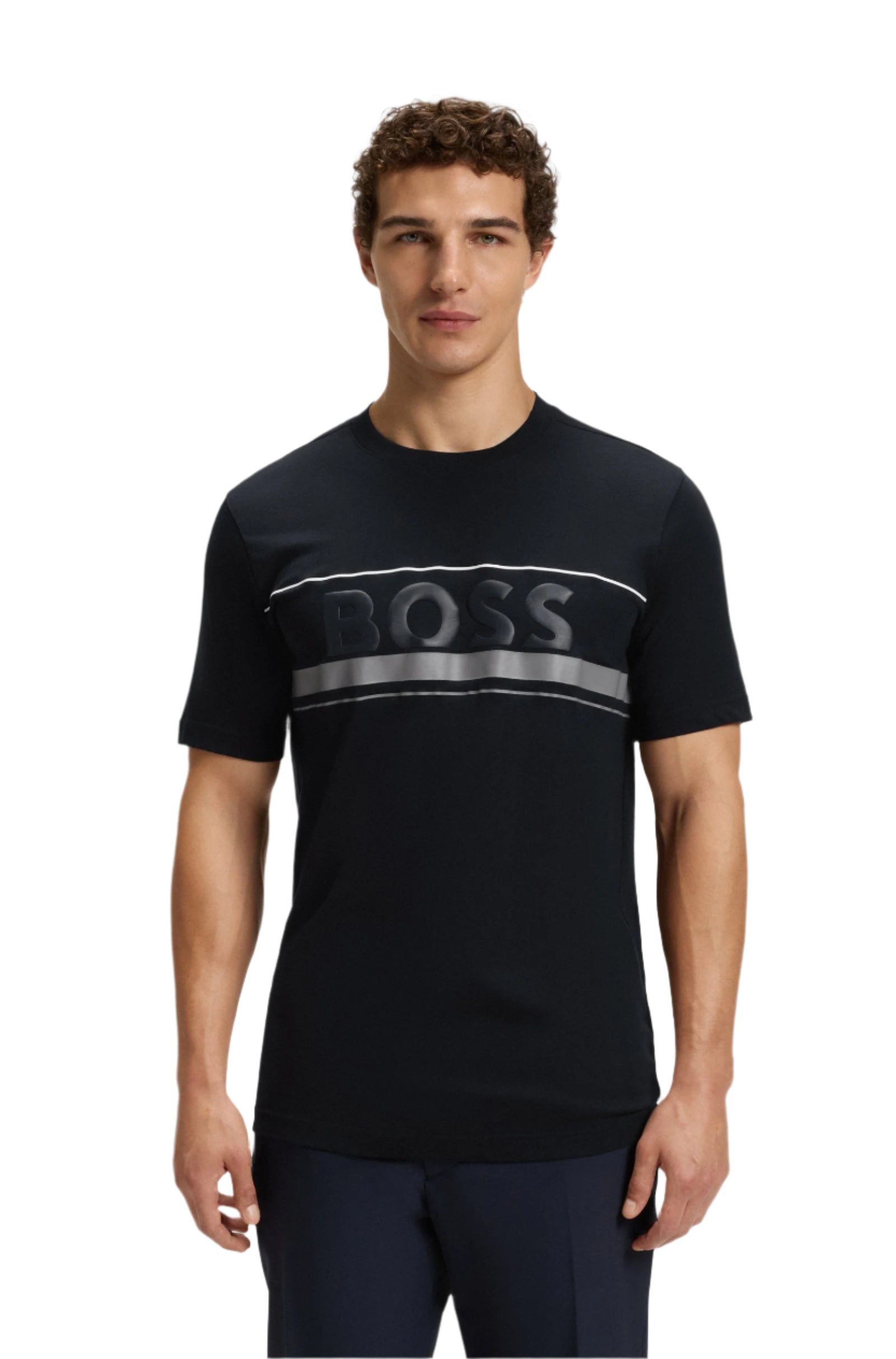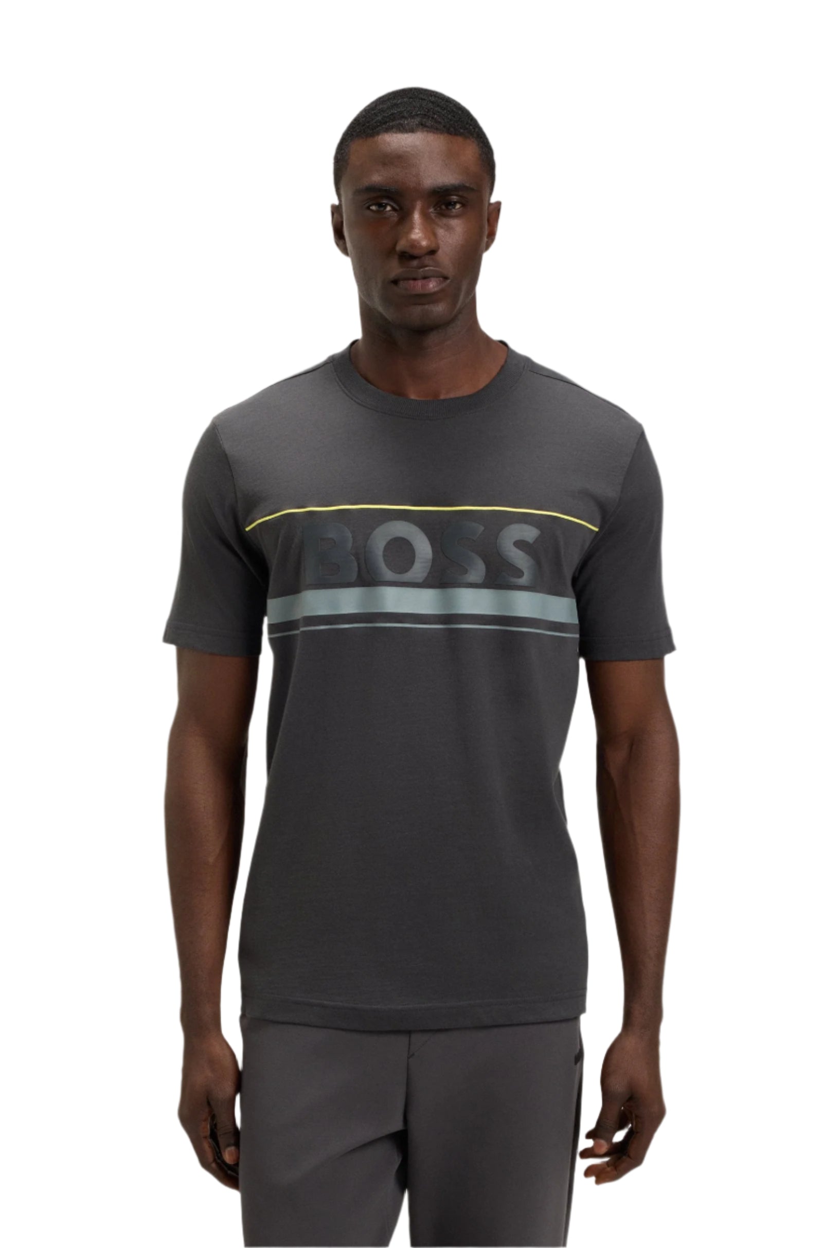 In breathable cotton jersey, this BOSS Menswear T-shirt is ideal for everyday casual wear. Sporty stripes and a large BOSS logo.