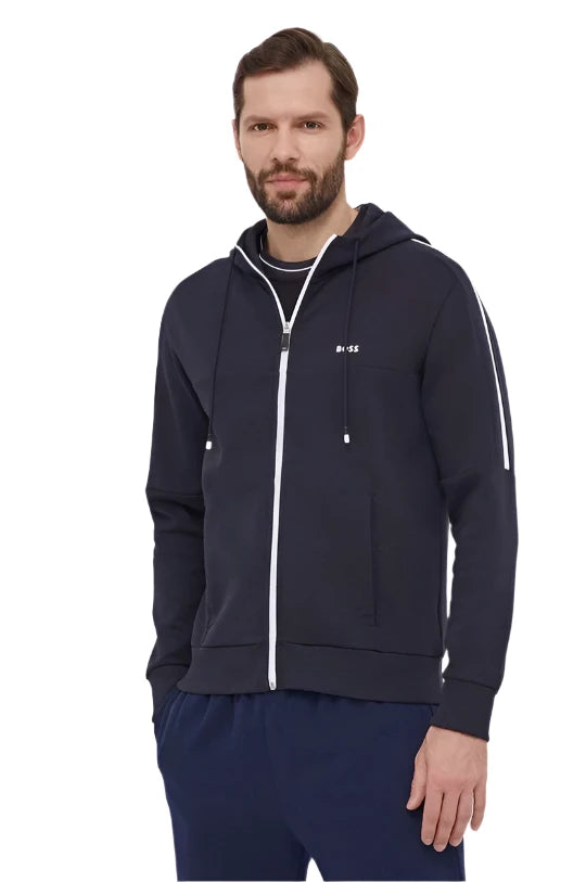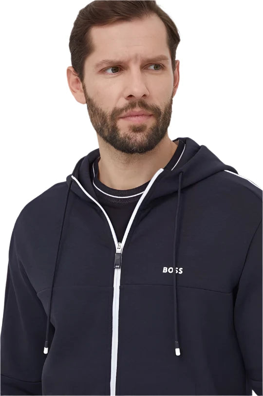 Style: Boss Athleisure men's zip-up hoodie, with an understated logo and contrast colour piping along the arms. Also features logo tape along the hood line.