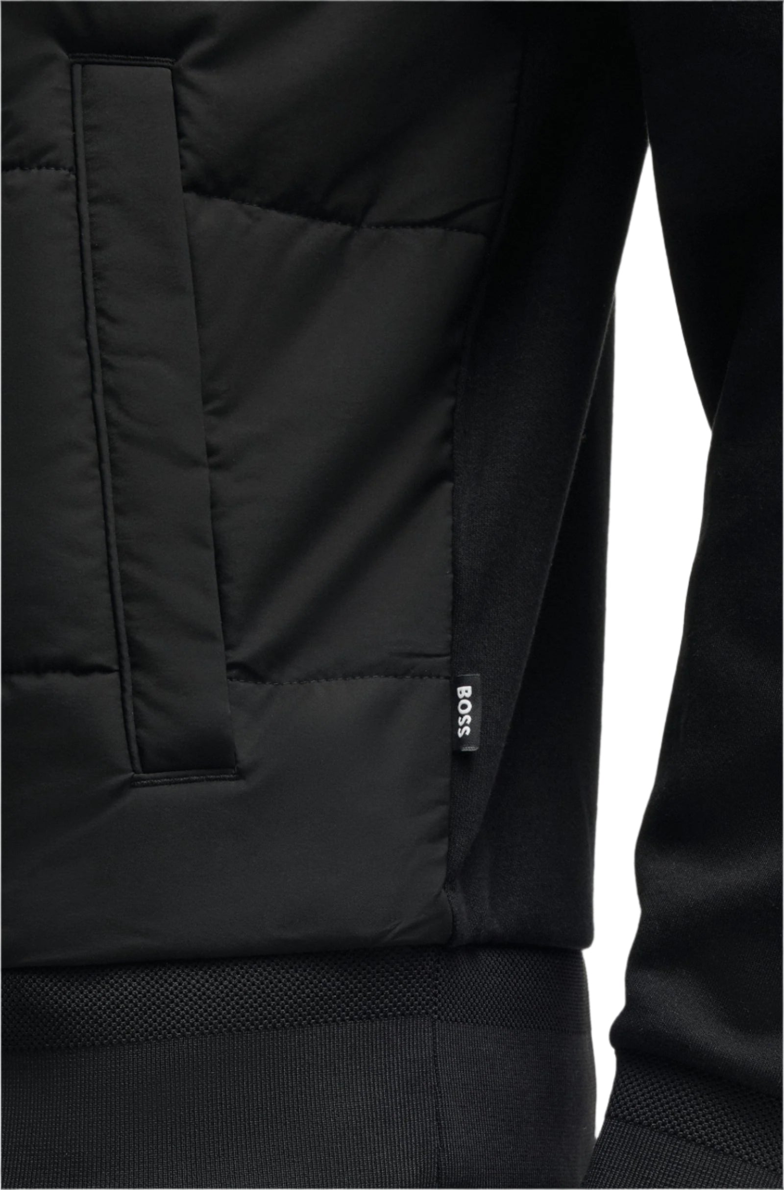 Style: Boss sportswear men's cotton-blend, hoodless, hybrid zip-up with a padded front and a badge logo on the arm.