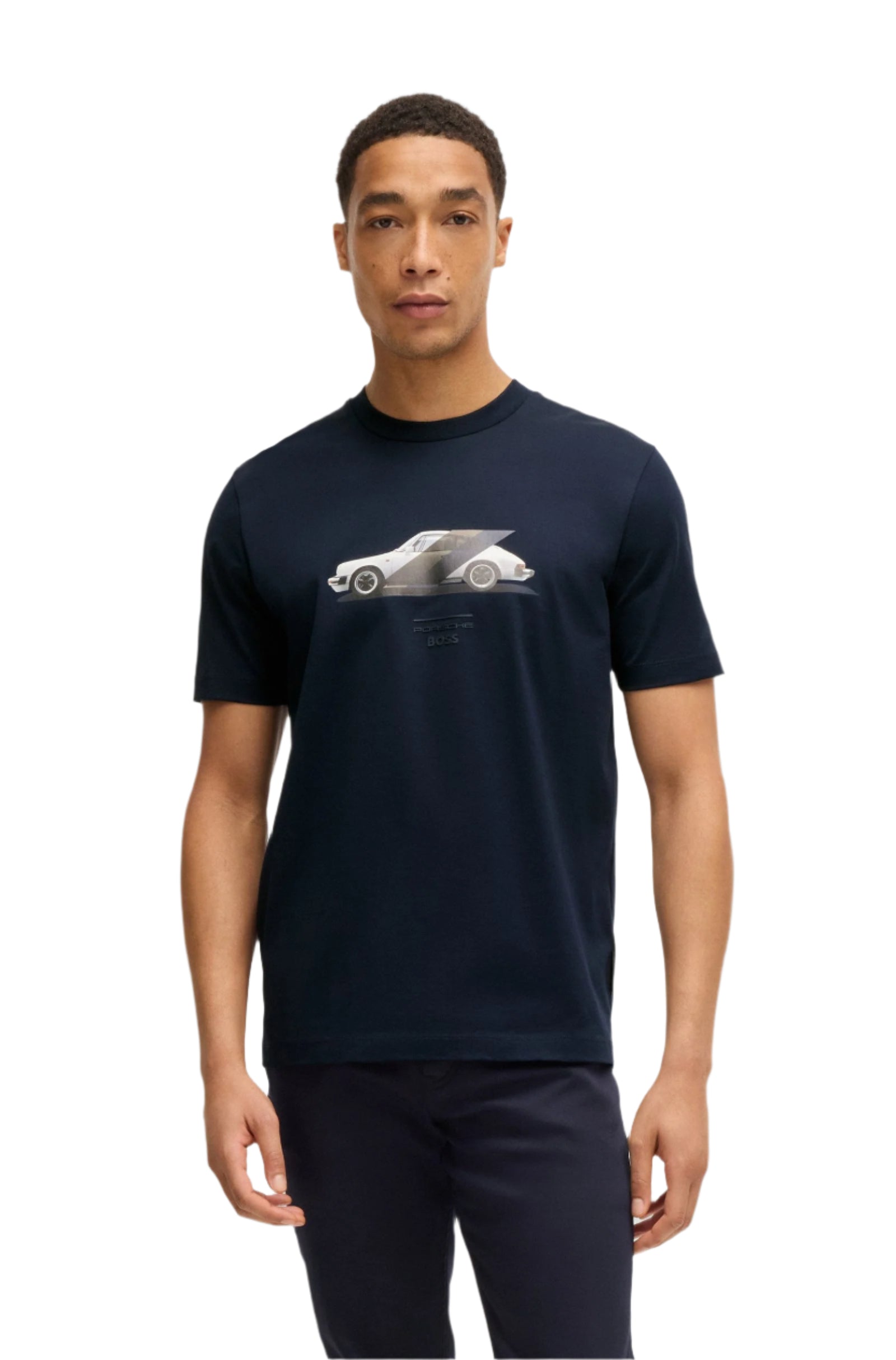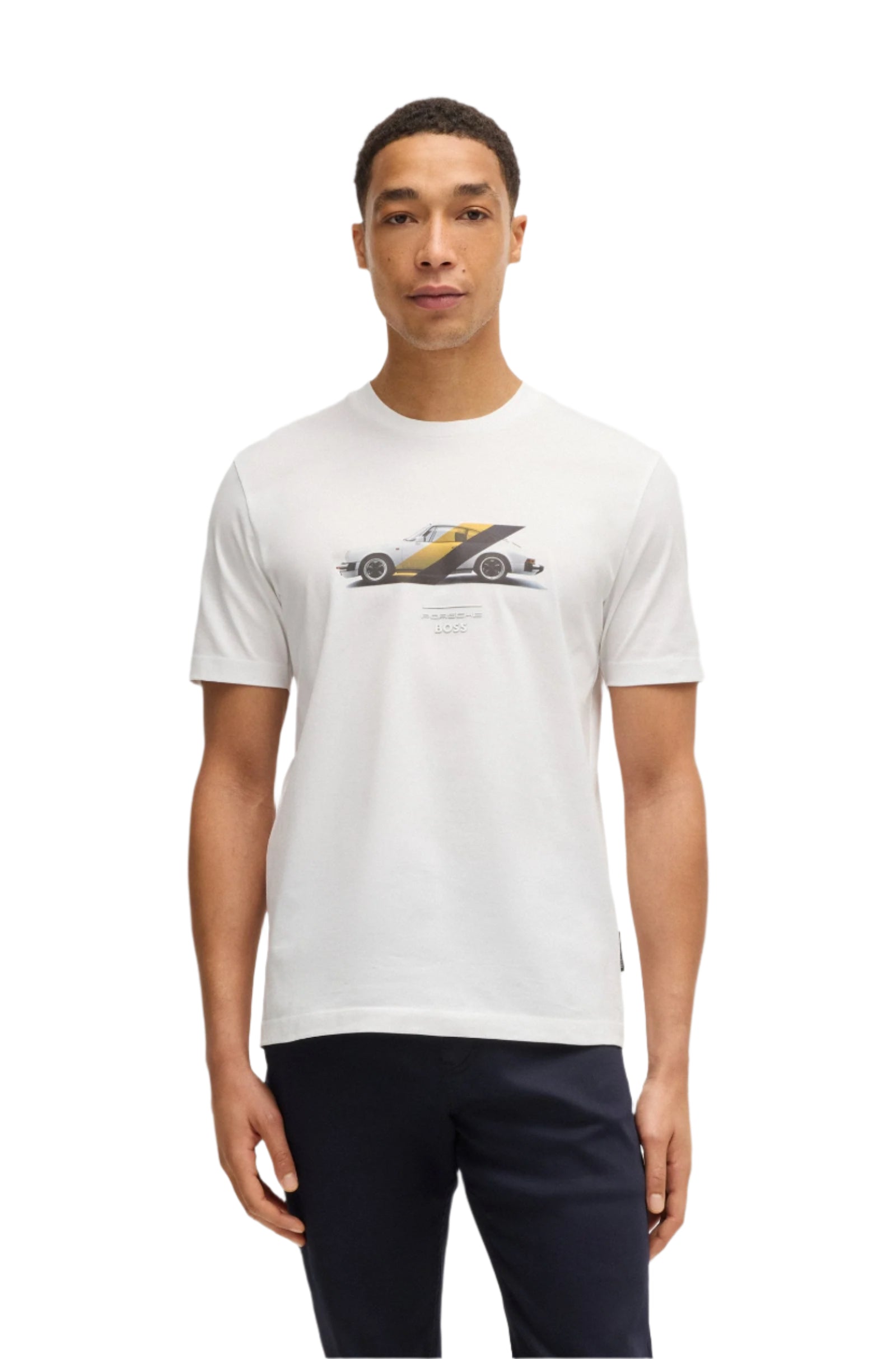 Style: Boss Sportswear x Porsche collaboration men's short-sleeve t-shirt. Complete with a Porsche graphic and dual rubberized logos.
