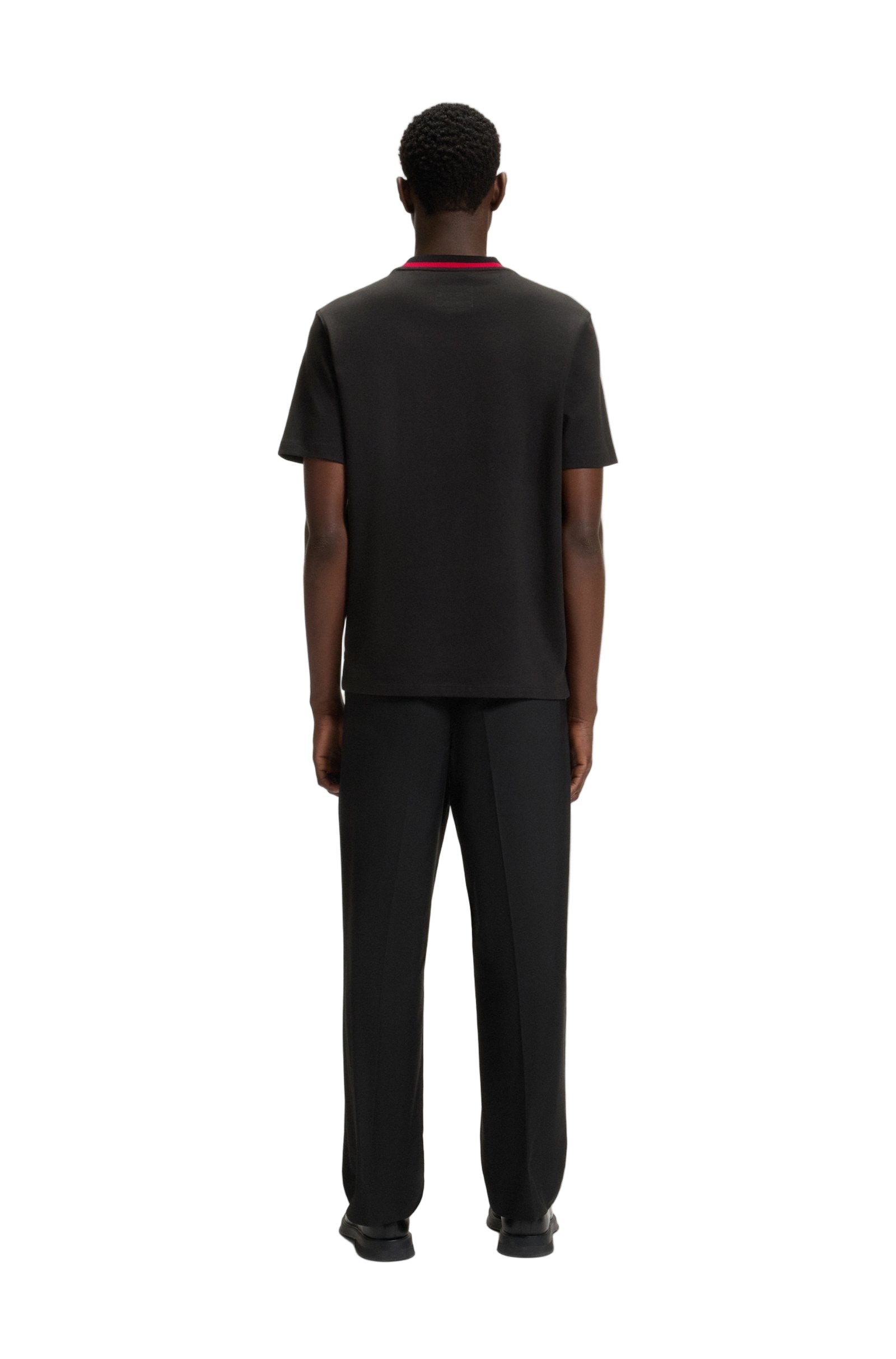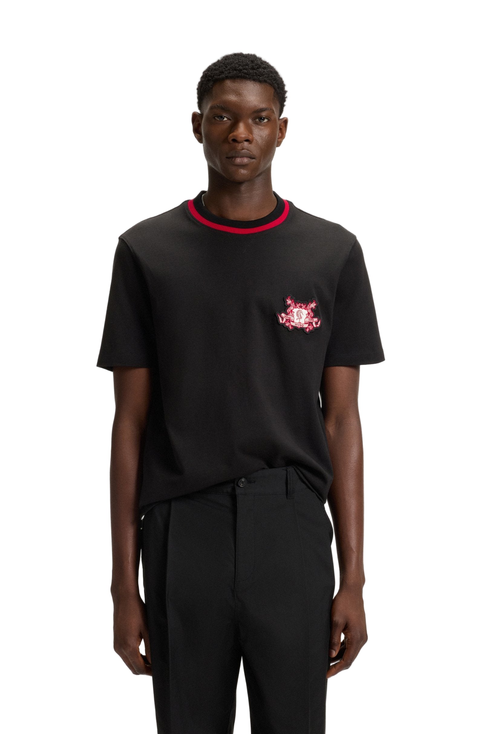 Style: Hugo men's short-sleeve t-shirt in a cotton jersey material, featuring a collegiate logo patch and a ribbed, striped collar.