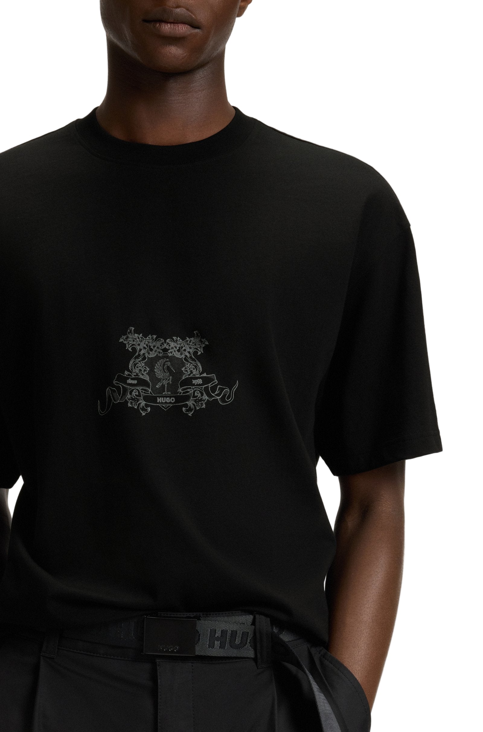 Style: Hugo men's short sleeve t-shirt, featuring collegiate logos and tapestry-inspired prints on the front and back.