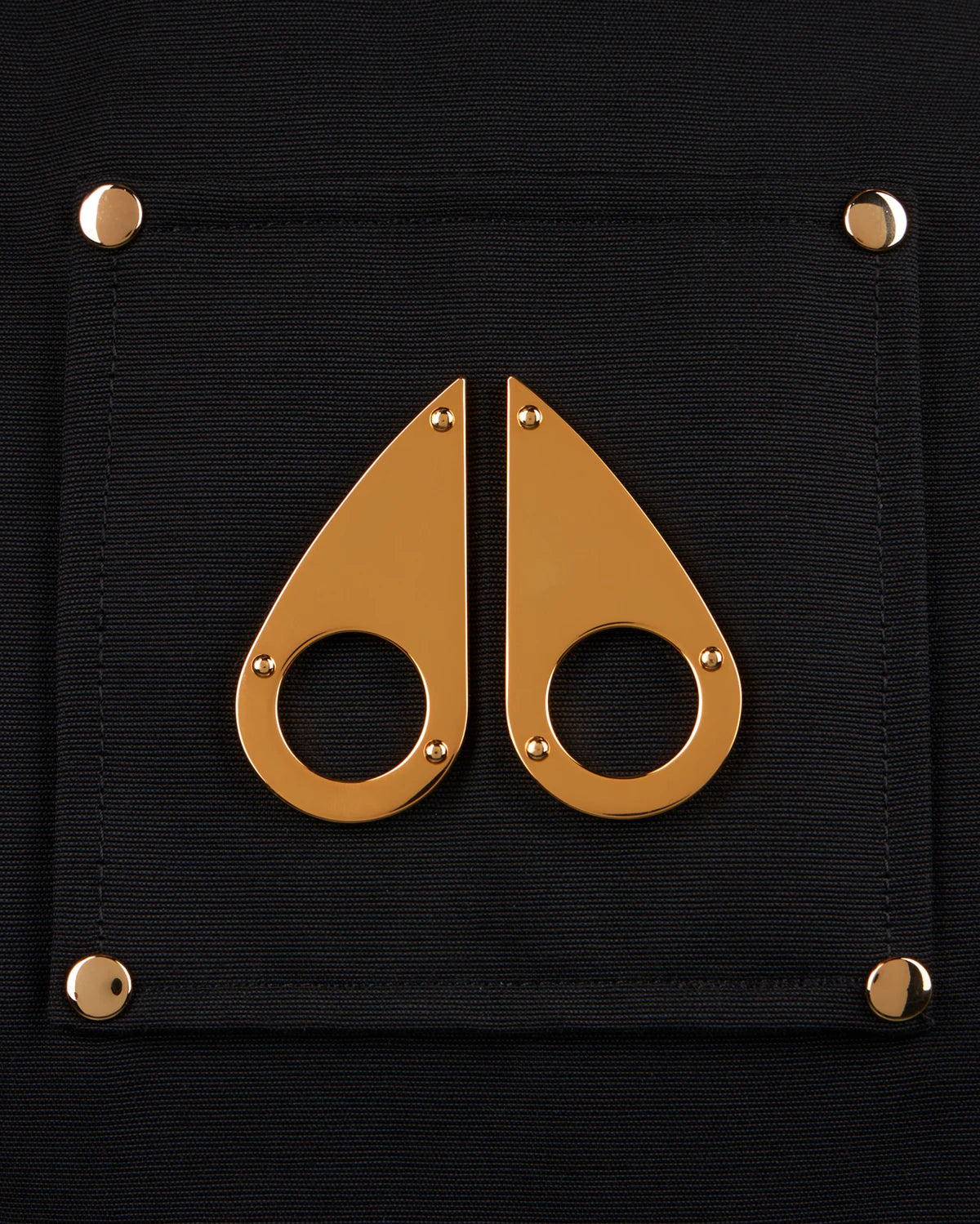 This jacket offers durable warmth with a cotton/nylon shell, 90/10 down fill, and a removable shearling hood. It includes stylish J-seam chest pockets and a gold Moose Knuckles logo for a refined look.