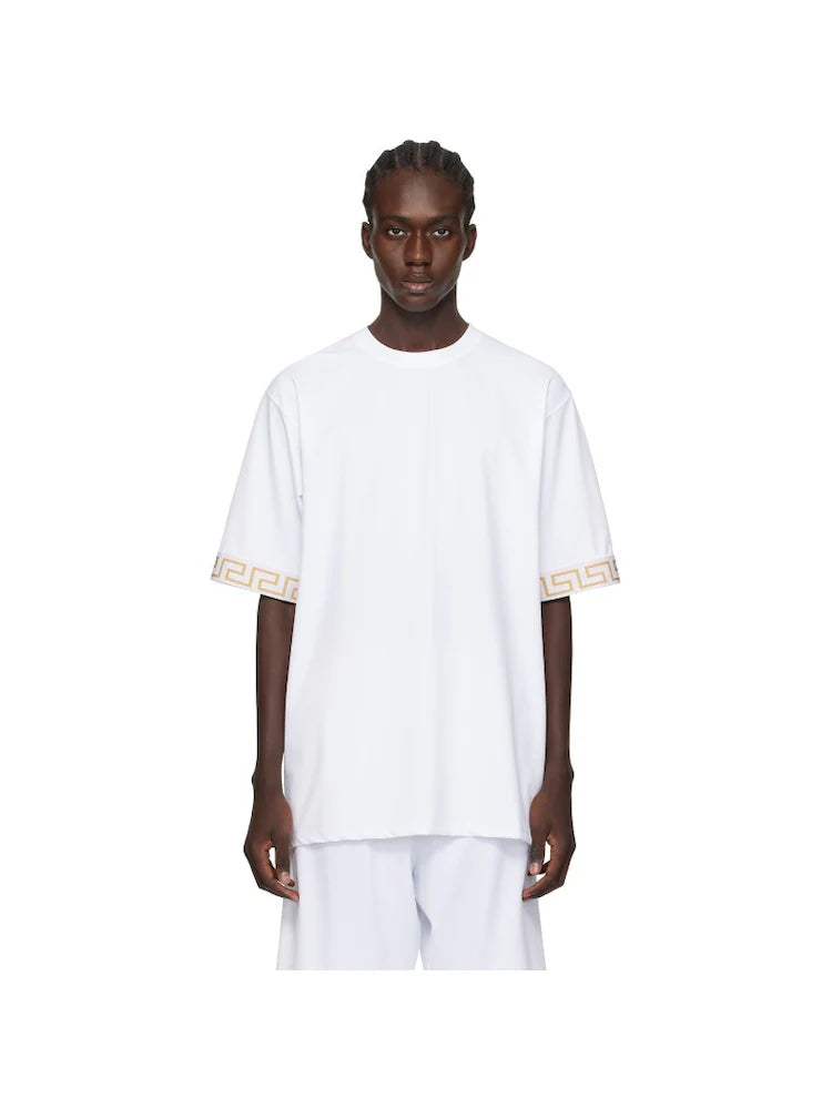 Style: Versace men's oversized top with Grecca accents at the hem of the sleeve. Complete with a minimalistic logo at the back of the neck.